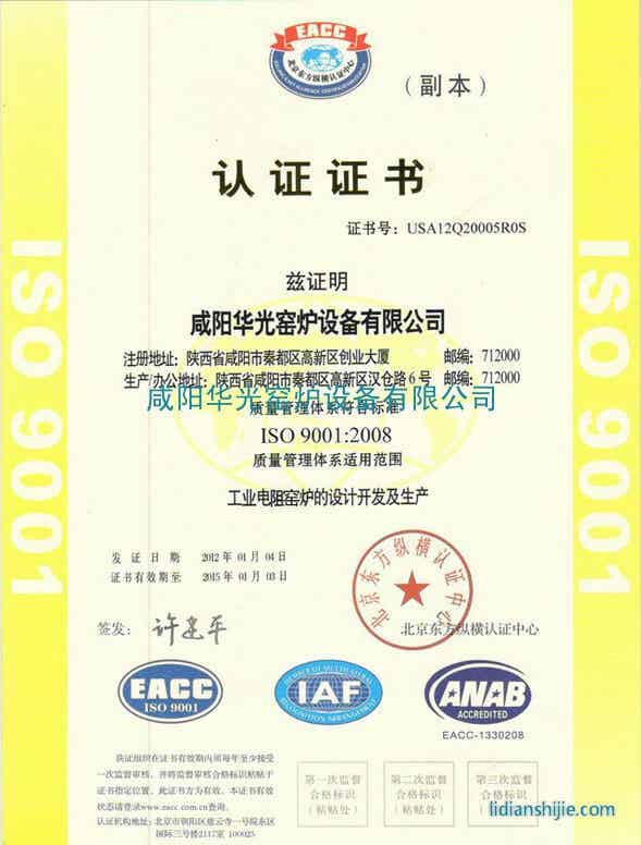 祝賀我公司正式通過ISO9001:2008質量管理體系認證。ISO是由各國標準化團體(ISO成員團體)組成的世界性的聯合會。通過ISO國際標準認證的企業,證明其技術和管理上達到了世界范圍競爭力。此次咸陽華光窯爐設備有限公司順利通過ISO國際標準化認證,標志著公司科學規范管理再上一個臺階。
