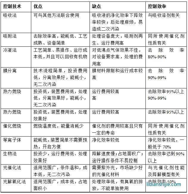 不同的治理技術(shù)都有其特定的適用范圍和使用條件,只有在其特定的適用范圍和使用條件下才能夠達到理想的治理效果,在經(jīng)濟上也是合理的。表1比較了各種技術(shù)的優(yōu)缺點及其控制效率。