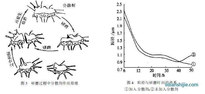 1 .1 分散劑的助磨作用 原料粉碎是陶瓷制備過程中的一個重要環(huán)節(jié), 而其中濕磨法又是行之有效的方法之一, 在濕法球磨中, 由于分子或粒子的相互撞擊、靠近、吸引, 粉料往往會產(chǎn)生團聚.特別是研磨到一定時間后, 還有可能出現(xiàn)一個問題即“逆研磨”現(xiàn)象[ 4] .即在粉碎時, 當物料達到一定細度時, 如果繼續(xù)下去, 就會出現(xiàn)粒度不會越來越細反而越來越粗的現(xiàn)象.為此人們進行了大量的實驗研究 .發(fā)現(xiàn)加入分散劑后, 由于其靜電穩(wěn)定及空間穩(wěn)定機制, 能有效打碎粉料中的弱團聚(見圖3), 獲得粒度更細, 直至亞微米級的粉料, 而且粉料粒度分布均勻, 粒形更接近于球形.這樣可以提高研磨效率, 節(jié)約能耗.從圖4 我們可以看到, 加了分散劑的試樣尚未發(fā)生逆研磨, 而且極限粒徑要小于未加入分散劑的試樣.圖3 研磨過程中分散劑作用原理圖4 粒徑與研磨時間的關(guān)系①加入分散劑;②未加入分散劑