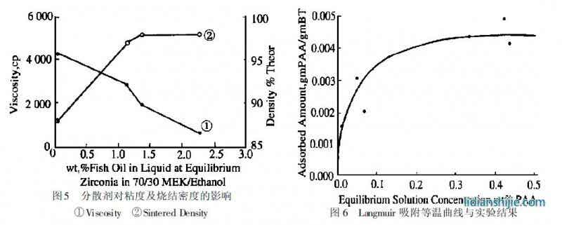 2 .1 .1 分散劑的最佳用量 經(jīng)過實驗證明, 無論是用于研磨, 還是用于陶瓷漿料的穩(wěn)定分散, 都存在一個最佳用量的問題.隨著分散劑的加入, 陶瓷漿料的粘度逐漸降低, 陶瓷燒結(jié)后密度更接近于理論密度(見圖5).但分散劑的用量有一定限度, 超過一定量后, 粘度不會減小, 反而可能增加.其主要原因是分散劑過量時, 粉體吸附的分散劑達到單層飽和狀態(tài), 使進入液相的自由分散劑分子濃度增大, 對粉體產(chǎn)生橋聯(lián)作用, 從而使粉體間的作用加強, 漿料粘度加大.所以從理論上來說, 最佳的用量取決于