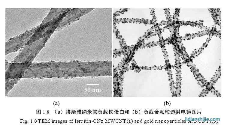 (4)催化。與純的碳納米管相比,摻雜碳納米管可以和蛋白質、Au、Ag、Fe和Pt的金屬簇形成有效共價連接,使得催化劑在其表面均勻分散并具有較高的熱穩定性,成為很好地催化劑載體(圖1.8)。此外氮原子的摻雜可使取代位附近的碳原子呈現一定的電正性,這使得摻氮碳納米管對氧化還原反應具有良好的電催化活性,成為可替代燃料電池中價格昂貴的鉑電極的潛在替代材料。
