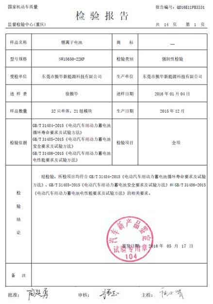 動(dòng)力電芯產(chǎn)品已通過GB/T 31484、GB/T 31485、GB/T 31486、UL1642、UN38.3、QC/T 743、RoHS、REACH認(rèn)證