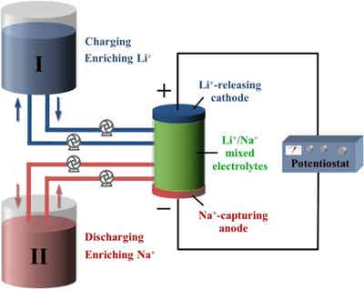 此外,該新型電池獨(dú)特的工作方式還使其具有Li+/Na+分離的功能。通過構(gòu)建如圖2所示的簡(jiǎn)單反應(yīng)體系,通過反復(fù)的充放電過程即可分別實(shí)現(xiàn)對(duì)Li+和Na+的富集,與現(xiàn)有的化學(xué)分離技術(shù)相比操作更為簡(jiǎn)便且更加綠色環(huán)保,因此該技術(shù)在海(或鹵)水中Li+和Na+的大規(guī)模分離方面具有重要的應(yīng)用前景。