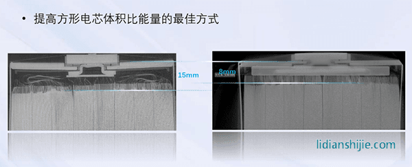 據介紹,“問頂電池”的創新之處在于縮短極耳長度,改變其與轉接片的連接方式,采用一體化焊接技術,使得電芯內部結構實現了一體化的連接,把原有的頂部空間由15mm縮減到了8mm,使電芯內部空間利用率有效提升7%以上。