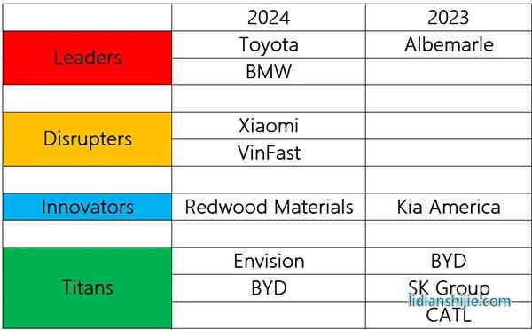 在新能源汽車和鋰電領域,今年全球共有七家企業入榜,包括豐田、寶馬、比亞迪、小米、越南VinFast五家整車企業,旗下布局鋰電業務的遠景科技集團,以及一家電池回收企業Redwood Materials。