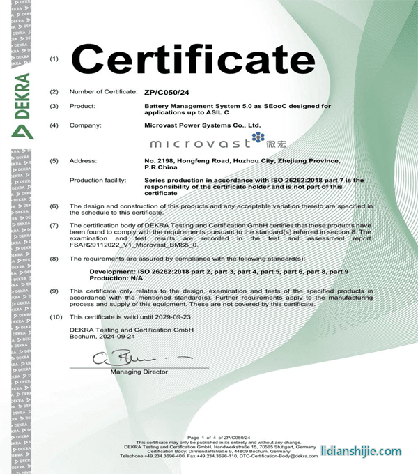 10月23日,微宏動(dòng)力第五代BMS產(chǎn)品獲得了國(guó)際獨(dú)立第三方檢測(cè)、檢驗(yàn)和認(rèn)證機(jī)構(gòu)DEKRA德凱頒發(fā)的ISO 26262 ASIL C功能安全產(chǎn)品認(rèn)證證書(shū)。這一認(rèn)證證書(shū)的獲得標(biāo)志著微宏動(dòng)力的電池管理系統(tǒng)(BMS)在安全性與可靠性方面開(kāi)啟了全新篇章,進(jìn)一步展示了其在動(dòng)力電池領(lǐng)域的產(chǎn)品力和競(jìng)爭(zhēng)力。頒證儀式于湖州微宏動(dòng)力公司舉行,微宏動(dòng)力產(chǎn)品研究院院長(zhǎng)肖寧強(qiáng)以及DEKRA德凱中國(guó)功能安全技術(shù)經(jīng)理劉杰等共同出席。