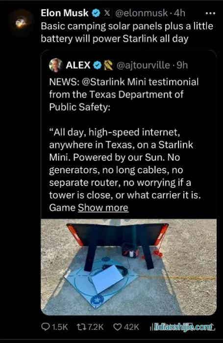 馬斯克寫道,露營用光伏發(fā)電板搭配光充戶外電源,可以為Starlink全天候供電。