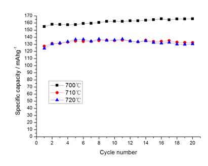 圖2是不同溫度制備的LiFePO4/C復合材料的循環性能曲線。從圖2可以看出,在考察的溫度范圍內,不同溫度下合成的樣品的電化學性能還是有明顯的差異。700℃合成的樣品在0.2C倍率下充放電,首次放電比容量最高為154.9mAh/g,首次放電效率達到94.05%。并且放電容量有明顯的上升的趨勢,可以看出在第20次達到了最高的165.9mAh/g,容量保持率高達107.1%。710℃、720℃合成的樣品的電化學性能相差不大,同樣在0.2倍率下,首次放電比容量分別為127.4mAh/g、124.2mAh/g。放電容量仍均有上升的趨勢,分別在第9次和第8次循環達到最高的136.9mAh/g、137.3mAh/g。循環20次后的容量保持率都比較好,分別為103.8%、104.9%。
