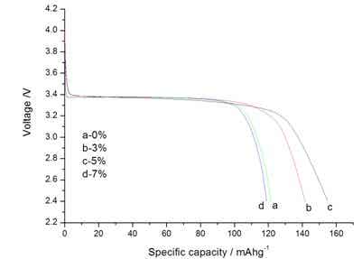 Fig 7 the initial discharge profiles of LiFePO4/C composite materials prepared at 700℃ at different coated carbon amounts