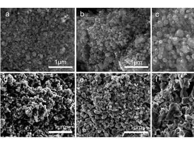 T.Drezen等[22]以溶膠-凝膠法合成了LiMnPO4。熱處理溫度不高于350℃時得到的樣品,結晶度較低;熱處理溫度高于600℃時得到的樣品,粒徑會快速增加,因此在450-600℃熱處理較合適。在520℃時合成的樣品,C/10可逆比容量為134 mAh/g,C/5可逆比容量為116 mAh/g,其產物的如下SEM圖4,a為煅燒溫度520℃、b為煅燒溫度600℃、e為煅燒溫度700℃。溶膠-凝膠法的優點可以通過控制工藝條件達到控制產物的形貌特征和粒徑大小,電化學性能較優良,具有產業化的可能性。
