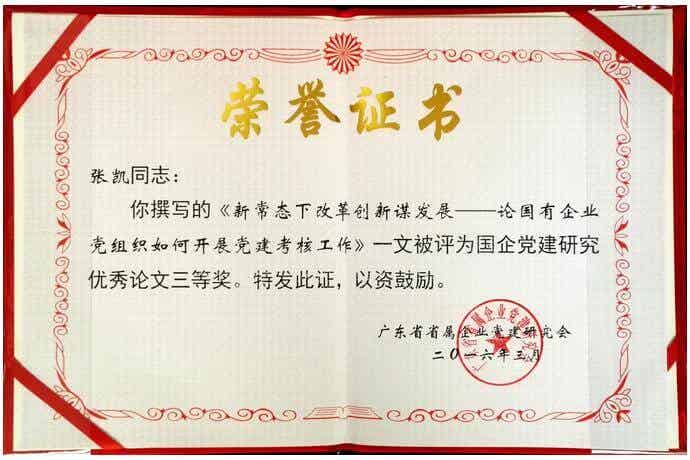 同時,各總支(支)部黨員干部從實際出發,結合全面從嚴治黨和企業轉型升級的要求,科學探討黨建考核的新方式新方法,共撰寫論文8篇。經公司黨委推薦上報3篇參加省屬企業黨建論文評選,經評選,公司總部黨總支第二黨支部張凱同志報送的黨建研究論文《新常態下改革創新謀發展——論國有企業黨組織如何開展黨建考核》,在參評的196篇論文中入圍優秀論文行列,榮獲三等獎及通報表揚。