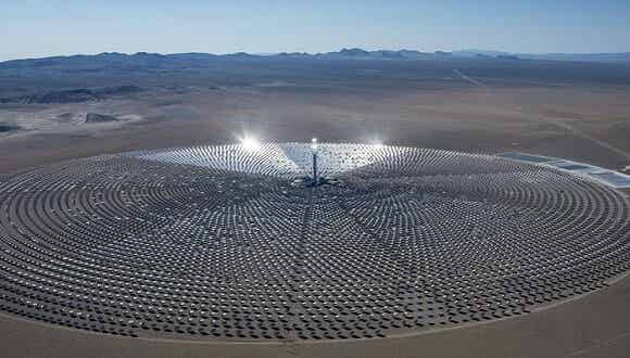 鋰電世界 從飛經內華達上空的飛機往下看,新月沙丘(Crescent Dunes)光熱電站就像是在地表上的一道明亮閃光。你只有在地表上看才會了解到它是多么的龐大:近675.8公頃的沙漠被10347個公告牌大小的定日鏡所覆蓋,這個發電站所提供的電量足以支撐75000所家庭。