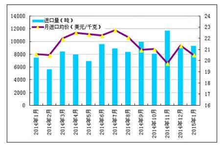 圖3 2014年1月-2015年1月多晶硅進口量及進口均價示意圖