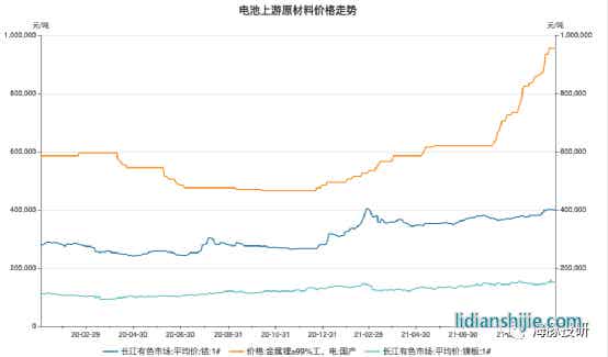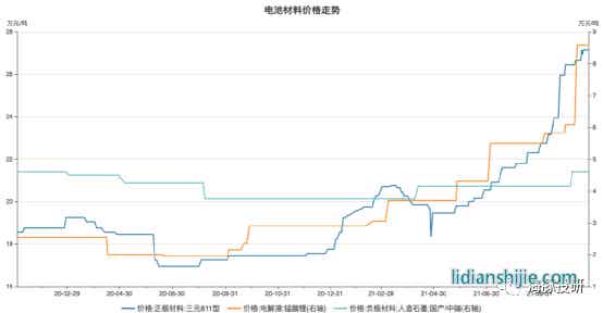 不過(guò)中下游面臨上游原材料漲價(jià)的現(xiàn)實(shí)是比較殘酷的,從下面兩張圖中我們可以看到,自2021年6月30日以來(lái),上游金屬鋰、鈷、鎳,電池直接材料正極、負(fù)極和電解液的價(jià)格均在繼續(xù)攀升,其中正極材料和電解液漲價(jià)迅猛,而負(fù)極材料當(dāng)前也面臨限電限產(chǎn)帶來(lái)的供應(yīng)緊張,總之電池廠的綜合成本面臨上行壓力。