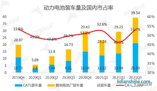 國(guó)內(nèi)新能源汽車滲透率超15%:2021年第三季度國(guó)內(nèi)新能源汽車銷95萬(wàn)輛,同比175%,滲透率由2020年第三季度的5.0%提升至16.6%;新能源車帶動(dòng)動(dòng)力電池需求:根據(jù)動(dòng)力電池產(chǎn)業(yè)創(chuàng)新聯(lián)盟數(shù)據(jù),2021年第三季度,國(guó)內(nèi)動(dòng)力電池裝機(jī)量39.5GWh,同比增136%,公司以21GWh的出貨量、53.2%的市占率穩(wěn)居第一并保持與第二位的差距(比亞迪二季度電池裝車量6.1GWh,市占率15.4%);