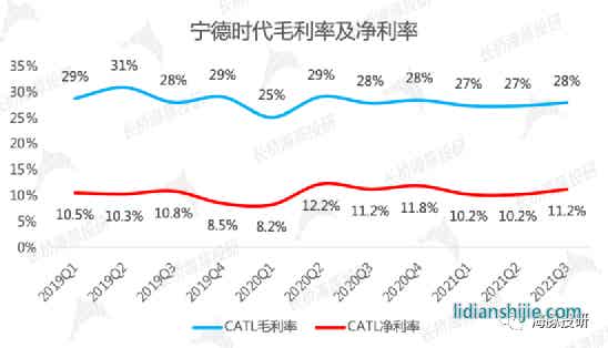 2、硬抗原材料漲價(jià),但毛利率企穩(wěn)回升,規(guī)模效應(yīng)、產(chǎn)業(yè)鏈話語(yǔ)權(quán)、儲(chǔ)能業(yè)務(wù)或是整體毛利率的穩(wěn)定劑。三季度動(dòng)力電池原材料價(jià)格依舊處于上漲通道,同時(shí)限電限產(chǎn)帶來(lái)部分原材料緊缺,電池廠的綜合成本繼續(xù)處于上行壓力中。同時(shí)公司三季度動(dòng)力電池出貨量同比環(huán)比的增速均高于整體營(yíng)收的同比環(huán)比增速,結(jié)合公司不漲價(jià)的口風(fēng),寧王硬抗了原材料漲價(jià)的壓力。但值得歡喜的是,公司三季度毛利率企穩(wěn)回升,長(zhǎng)橋海豚君認(rèn)為寧王在產(chǎn)業(yè)鏈中的強(qiáng)話語(yǔ)權(quán)、規(guī)模效應(yīng)的深化以及上半年毛利率高達(dá)37%的儲(chǔ)能業(yè)務(wù),或許是本季度整體毛利率的穩(wěn)定劑。