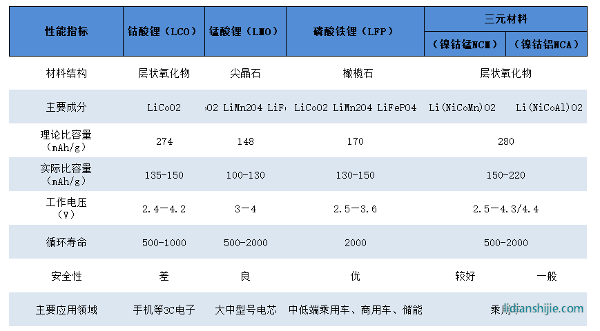 經過30余年的發展,當前用作鋰電池的正極材料其實并不少,產業化的主要有鈷酸鋰(LCO)、錳酸鋰(LMO)、磷酸鐵鋰(LFP)和三元材料(NCM、NCA)。