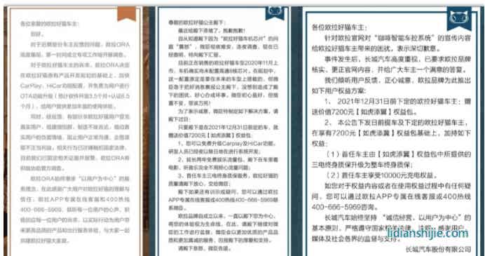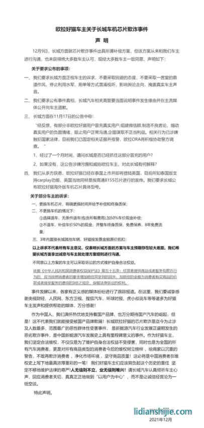 12月16日,歐拉好貓車主聯(lián)合發(fā)布維權(quán)聲明稱,長城汽車于12月9日發(fā)布的補(bǔ)償方案未與車主溝通,也未獲多數(shù)車主認(rèn)可: