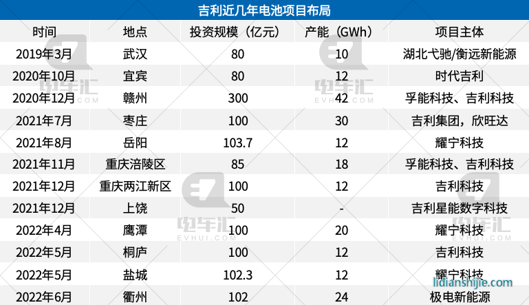 吉利近幾年電池業(yè)務(wù)布局(據(jù)公開報道統(tǒng)計)