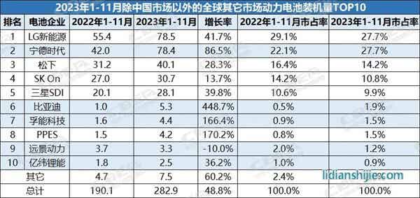 核心提示:統計數據顯示,2023年1-11月,在除中國市場以外的全球其它市場(海外市場),動力電池裝機量達282.9GWh,同比增長48.8%。