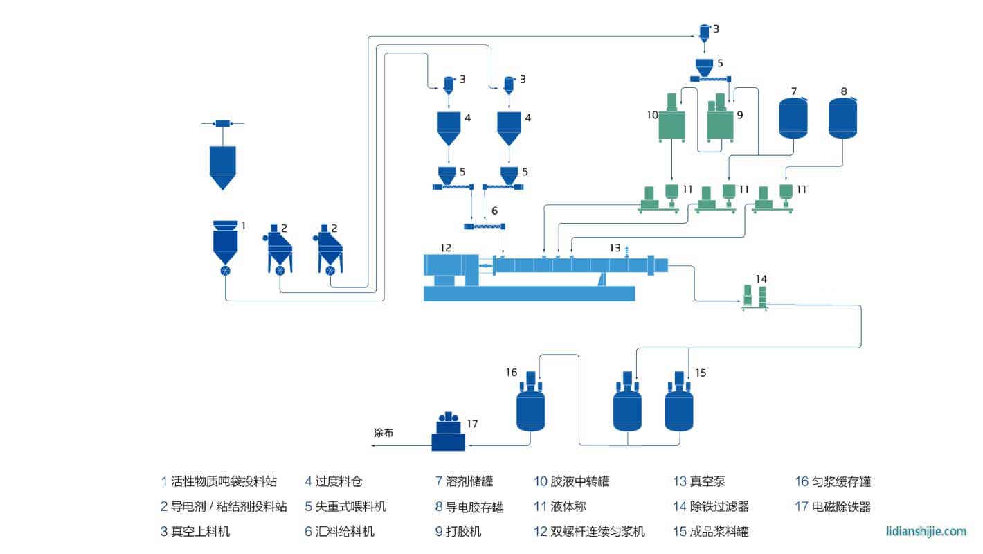 無錫靈鴿機械科技股份有限公司開發的連續在線雙螺旋勻漿機是一種新型連續高效的鋰電池正負極漿料制漿設備,具有傳統雙行星等間歇式制漿設備不可比擬的優勢,與投料系統、存料系統、失重計量給料系統、增壓泵、分散均質機、除鐵過濾器、管路系統、中央控制系統組成完整的鋰電池連續生產線,到達智能化、無人化、無塵化生產。