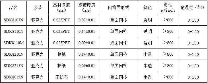 以棉紙/無紡布/聚酯膜為基材,雙面涂以特定復配亞克力膠水;利用特殊貼附壓紋離型材料組成的高性能雙面膠。