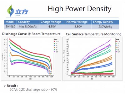 高功率產(chǎn)品平臺(tái)已成熟,量產(chǎn)的應(yīng)用于便攜式汽車應(yīng)急啟動(dòng)用功率密度型7442C5-3.5安培小時(shí)電池,在能量密度高達(dá)180瓦特小時(shí)每公斤同時(shí),功率密度高達(dá)2千瓦時(shí)每公斤,2C充電15C放電循環(huán)200次,容量保持率大于75%。該產(chǎn)品已通過(guò)了UL1642安規(guī)認(rèn)證。 目前正在開(kāi)發(fā)的無(wú)人機(jī)電池可支持≥5C持續(xù)放電,能量密度高達(dá)230瓦時(shí)每公斤,5C放電溫升小于35℃