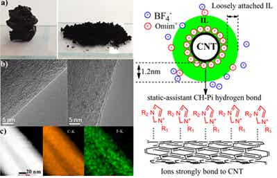 圖1. 左圖:a)離子液體/碳納米管復合膠體與復合材料圖像 b、c)HHT與其相應復合材料的顯微圖及Mapping圖像;右圖:復合材料機理圖