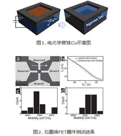 石墨烯作為一種新型的二維碳材料,由于其優(yōu)異的電學(xué)、光學(xué)性質(zhì)以及穩(wěn)定的化學(xué)特性,在微電子領(lǐng)域具有廣闊的應(yīng)用前景。化學(xué)氣相沉積方法是取得高質(zhì)量石墨烯的重要途徑之一,但將石墨烯從金屬表面向目標(biāo)襯底的轉(zhuǎn)移是制約該方法推廣的“瓶頸”。四室研究團隊創(chuàng)造性地采用瓊脂糖凝膠作為固體電解質(zhì),利用電化學(xué)方法實現(xiàn)了石墨烯的綠色高效轉(zhuǎn)移。該轉(zhuǎn)移方法可推廣至大尺寸石墨烯薄膜的制備,為石墨烯的大規(guī)模應(yīng)用提供了可行的途徑。