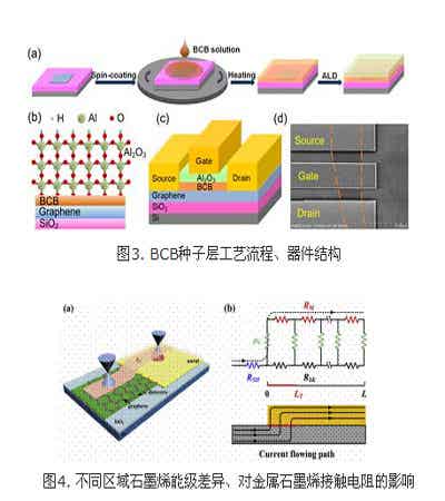 在石墨烯射頻器件的制備過程中,已有的柵介質(zhì)制備方法在工藝的可控性和器件性能方面具有一定的缺陷。四室研究團隊利用旋涂的方法在石墨烯表面形成BCB薄膜,并以此作為種子層進行了氧化鋁介電層的沉積生長。該方法不僅具有極好的工藝可控性,由于BCB特殊的化學(xué)結(jié)構(gòu),避免了對石墨烯性能的不利影響,實現(xiàn)了高性能石墨烯射頻器件的制備。