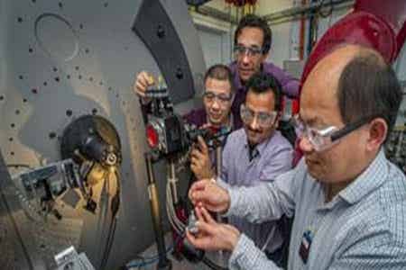 布魯克黑文實(shí)驗(yàn)室的王馮教授鄭將陰極材料樣品諸如XRD衍射儀的樣品托里,地點(diǎn)為NSLS II。組里的其他成員(從左到右)為Jianming Ba, Eric Dooryhee 和Sanjit Ghose。