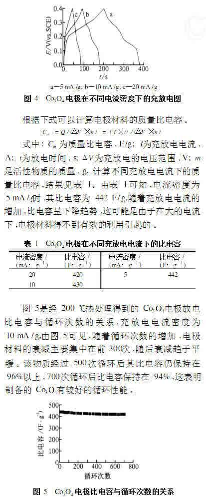LinChuan等使用醇鹽水解法制備了超細Co2O3電極活性材料,單電極比電容達到291F/g。此外CoOx和其他金屬氧化物的復合也被廣泛地研究。筆者以檸檬酸為模板,以硝酸鈷為原料利用水熱法制備了前驅體,200℃熱分解制得Co3O4,研究其在6mol/LKOH溶液中和-0.1~0.5V(vs.SCE,下同)電位范圍內,循環伏安、恒流放電等電化學電容性能。