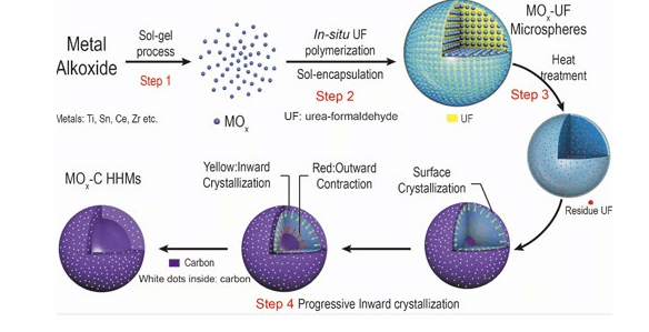 他們從聚合誘導(dǎo)膠體凝聚法出發(fā),首次提出了基于實(shí)心顆粒內(nèi)部梯度結(jié)晶的獨(dú)特方式來(lái)直接在顆粒內(nèi)部構(gòu)筑空心復(fù)合結(jié)構(gòu)。在實(shí)驗(yàn)中,他們通過(guò)對(duì)具有較低結(jié)晶度的有機(jī)-無(wú)機(jī)復(fù)合前驅(qū)體結(jié)晶過(guò)程的精確控制,實(shí)現(xiàn)了實(shí)心顆粒由外及里的逐步結(jié)晶,并通過(guò)顆粒內(nèi)部應(yīng)力的累積及調(diào)控使得顆粒的內(nèi)核自動(dòng)分裂而直接產(chǎn)生空腔。此方法操作簡(jiǎn)單、綠色環(huán)保、成本低、可規(guī)模化生產(chǎn)且具有普適性,可以成功制備一系列不同氧化物的復(fù)合空心結(jié)構(gòu)。基于相關(guān)方法制備的Li4Ti5O12-C空心復(fù)合微球可作為鋰離子電池負(fù)極材料,并表現(xiàn)出優(yōu)異的循環(huán)穩(wěn)定性和高倍率性能。