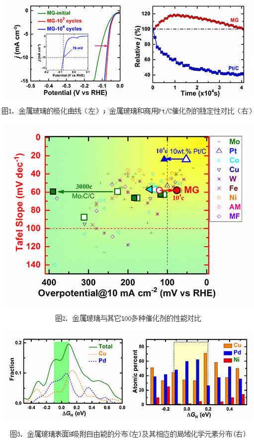 中國科學(xué)院物理研究所研究員汪衛(wèi)華研究組與中國科學(xué)院北京納米能源與系統(tǒng)研究所研究員孫春文課題組及北京計算科學(xué)研究中心青年千人計劃研究員管鵬飛課題組合作,研究發(fā)現(xiàn)Pd基非晶態(tài)合金(又稱金屬玻璃Metallic Glass, MG)作為電化學(xué)分解水的催化劑,不僅表現(xiàn)出優(yōu)異的催化活性,并且具備獨特的自穩(wěn)定性。