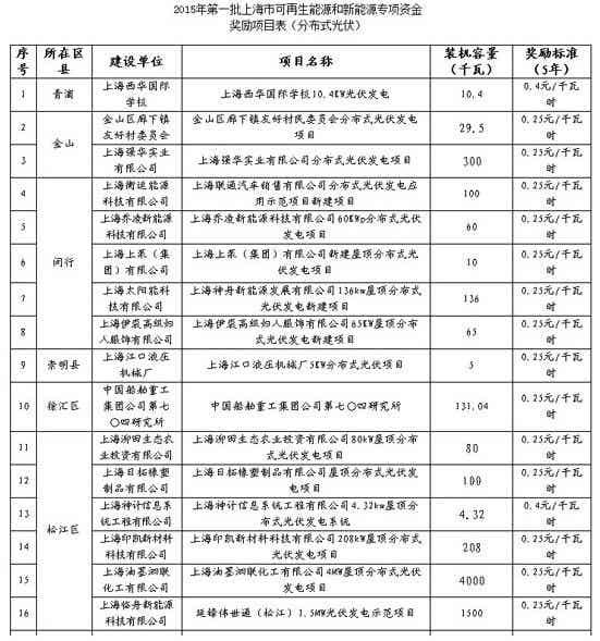 根據《上海市可再生能源和新能源發展專項資金扶持辦法》(滬發改能源〔2014〕87號,以下簡稱《扶持辦法》),市發展改革委會同相關部門和單位,組織開展了2015年第一批可再生能源和新能源發展專項資金扶持項目的申報和評審工作。在專家評審意見的基礎上,經審核,青草沙等2個風電項目(共96兆瓦)、上海西華國際學校等27個分布式光伏項目(共9100.26千瓦)和389戶個人光伏(共2097.049千瓦)符合條件,擬列入市可再生能源和新能源發展專項資金獎勵目錄予以支持(詳見附表)。