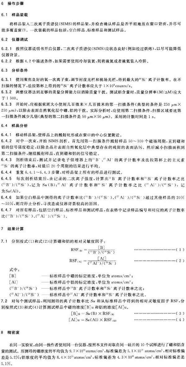 需要一個共摻雜或分別摻雜硼和鋁的硅單晶標(biāo)準(zhǔn)樣品,且硼和鋁的體濃度經(jīng)過各方都認(rèn)同的其他測量方法測定,濃度在(1-10)×1015atoms/cm3范圍內(nèi),分布均勻性在5%以內(nèi)。標(biāo)準(zhǔn)樣品的分析面應(yīng)進(jìn)行化學(xué)腐蝕拋光或者效果更好的化學(xué)機(jī)械拋光,使其平坦光滑。