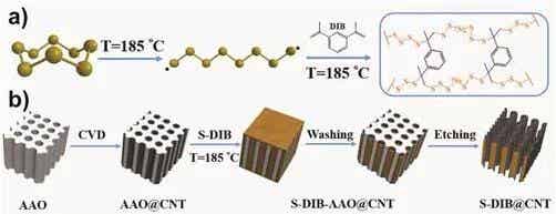 近期,中國科學院金屬研究所沈陽材料科學國家(聯合)實驗室先進炭材料研究部儲能材料與器件研究組在高性能多組元復合硫電極材料方面開展了系列研究工作。他們首先采用密度泛函理論計算,以氮摻雜石墨烯作為模型,發現在不同的氮摻雜形式中吡啶氮的團簇能夠較強地吸附多硫化物分子,并提出了組元與多硫化物相互作用的能量判斷關系。在此基礎上,通過氨氣高溫處理氧化石墨烯的方法,獲得了具有優異電化學性能、高含氮量的氮摻雜石墨烯。為了進一步提高對多硫化物的限制效果,將碳納米管對多硫化物的物理限制作用與有機硫聚合物中碳-硫鍵對多硫化物的化學限制作用相結合,將有機硫聚合物裝填到陽極氧化鋁為模板合成出的碳納米管中,制備出有機硫聚合物/碳納米管復合材料(圖1)。該復合材料通過碳納米管的管腔物理限制多硫化物溶解,同時利用有機硫聚合物中的碳-硫鍵進行化學方式固定硫,協同抑制了多硫化物的穿梭效應。
