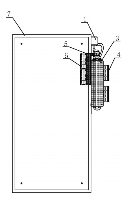 圖中:1-水箱,2-循環(huán)水泵,3-外部水冷卻熱交換排組,4-外散熱風機,5-內(nèi)部水冷卻熱交換排組,6-內(nèi)吸熱風機,7-電柜。