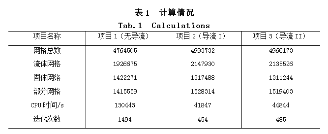 因結構相對復雜,取消“自動設置”選項,將“細小固體特征細化級別”設為3級,“細化流體網格”設為2級,啟用狹長通道細化,其中網格數目為6,細化級別為4級。因結構相同,在相同的設置下,3個項目劃分的網格數相近,網格總數為接近500萬個結構化網格,詳見表2。本分析采用8核處理器+16G內存專業析工作站計算。從CPU計算時間和迭代次數可觀察:雖然項目1的網格數量最少,但項目1的計算時間和迭代次數遠遠大于項目2和項目3,由此,可推測軟件在計算項目2和項目3比較流暢。