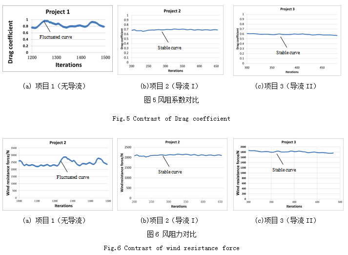 經迭代計算,可得到圖5,圖6和表2。其中圖5是三個項目車頭的風阻系數,圖6為三個項目車頭的迎風阻力。結合兩圖,可觀察到,項目1的迭代曲線波動很大,這是因為在無導流罩的情況下,風阻系數及迎風阻力都不易達到穩定計算。加了導流罩后,計算相對穩定了。
