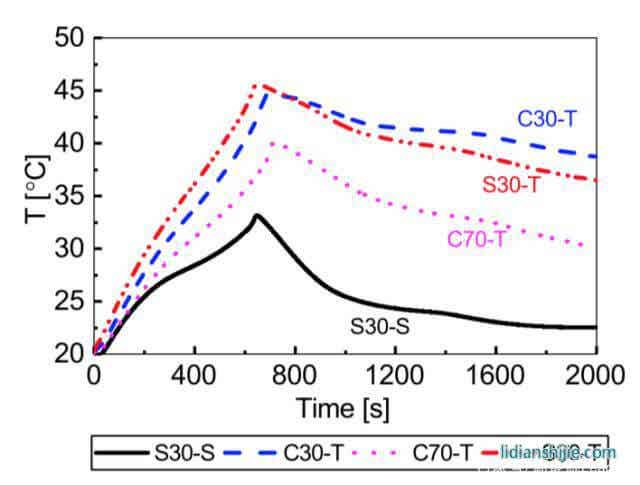 為了驗(yàn)證不同的散熱方式對(duì)鋰離子電池表面溫度的影響,作者對(duì)S30電池采用表面冷卻的方式進(jìn)行散熱,然后對(duì)于S30、C30和C70三個(gè)電池進(jìn)行極耳散熱,所有電池首先以1C進(jìn)行充電,然后以5C倍率進(jìn)行放電,接著進(jìn)行2C充電,在這一過程中電池表面溫度變化的如下圖所示。