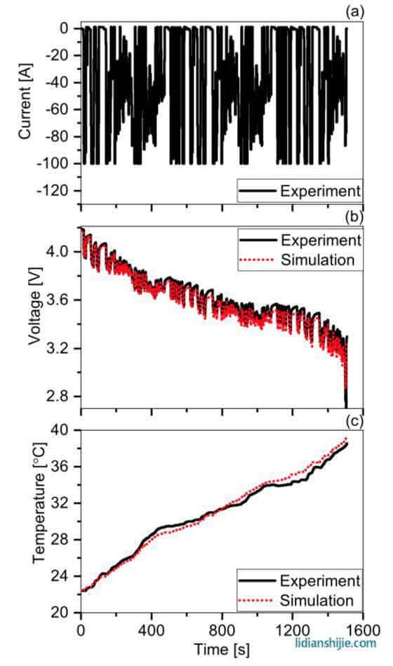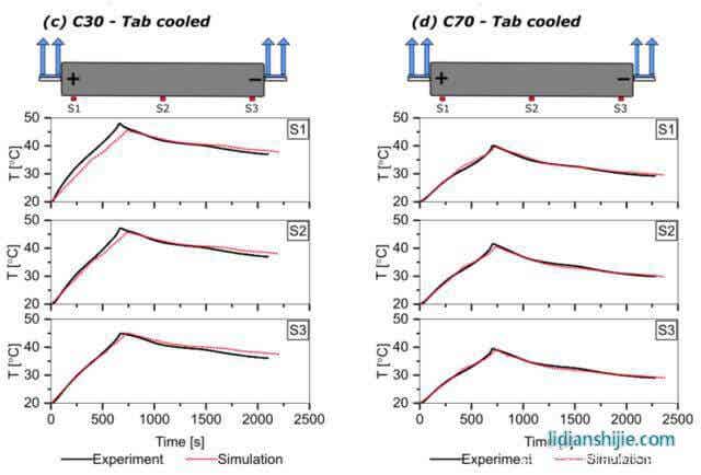 下圖為采用模型模擬的三種電池分別采用表面散熱、極耳散熱方式進(jìn)行熱管理時(shí)電池的溫度變化曲線,對(duì)于采用表面散熱的S30電池,模型得到的溫度與實(shí)際的溫度在S3位置最大誤差為1.5℃,對(duì)于采用極耳散熱的C30電池在S1和S3位置的最大誤差分別為-1.5℃和1.9℃,對(duì)于采用極耳散熱的S30和C70電池模型仿真結(jié)果與實(shí)際結(jié)果之間相差不到1℃,表明該模型能夠提供可接受精度的溫度預(yù)測(cè)。