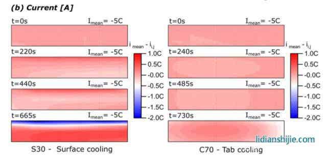 下圖為通過模型得到的采用表面散熱方式的S30電池和采用極耳散熱方式的C70電池內(nèi)部的溫度變化、電流分布變化和局部SoC變化,從下圖a我們能夠看到由于S30電池通過電池頂部表面散熱的方式對(duì)電池進(jìn)行散熱,因此能夠看到電池內(nèi)部出現(xiàn)了明顯的溫度梯度,相比之下采用極耳散熱方式的C70電池溫度就要均勻的多。