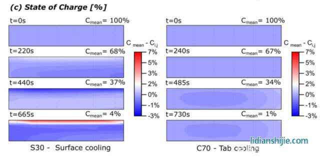 由于鋰離子電池的動(dòng)力學(xué)特性與電池的溫度密切相關(guān),因此由于溫度梯度的存在,我們能夠觀察到S30電池內(nèi)部也出現(xiàn)了顯著的電流分布不均的現(xiàn)象,而相比之下C70電池的溫度分布則要均勻的多。同時(shí)由于電流分布不均的存在最終也導(dǎo)致了S30電池內(nèi)部局部SoC的不均勻,在靠近冷卻面的位置由于電流較小,因此最終的SoC要明顯的高于其他位置。