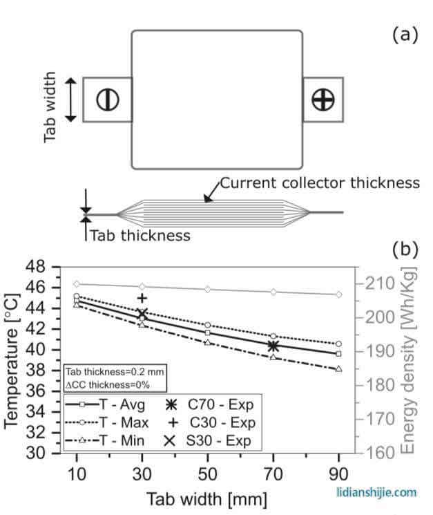 作者以散熱效果較好的C70電池作為基礎(chǔ),對(duì)極耳的結(jié)構(gòu)進(jìn)行了優(yōu)化設(shè)計(jì),下圖b展示了極耳寬度對(duì)于電池在放電過程中的平均溫度、最高溫度和最低溫度的影響,從圖中能夠看到電池極耳寬度從10mm提高到90mm,放電結(jié)束時(shí)電池的平均溫度從44.5℃下降到了39.5℃,電池在長(zhǎng)度方向上的最大溫差從1℃增加到了2.4℃,由于極耳重量的增加,電池的重量能量密度從210Wh/kg降低到了207Wh/kg。